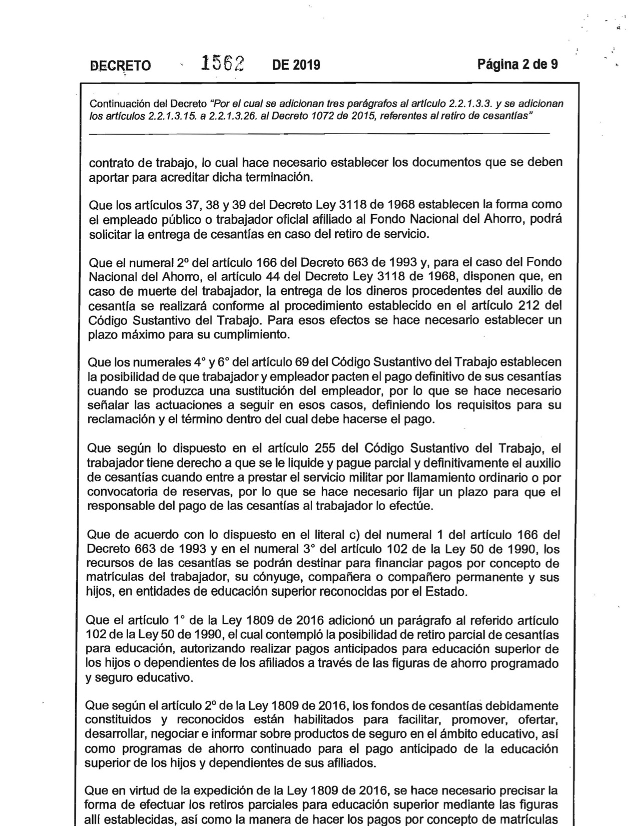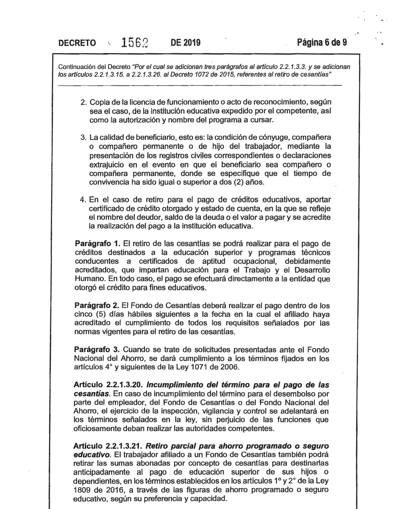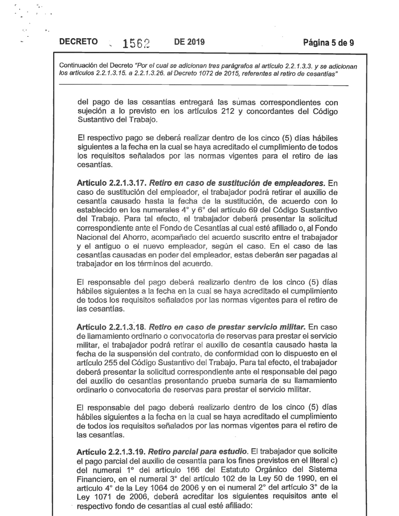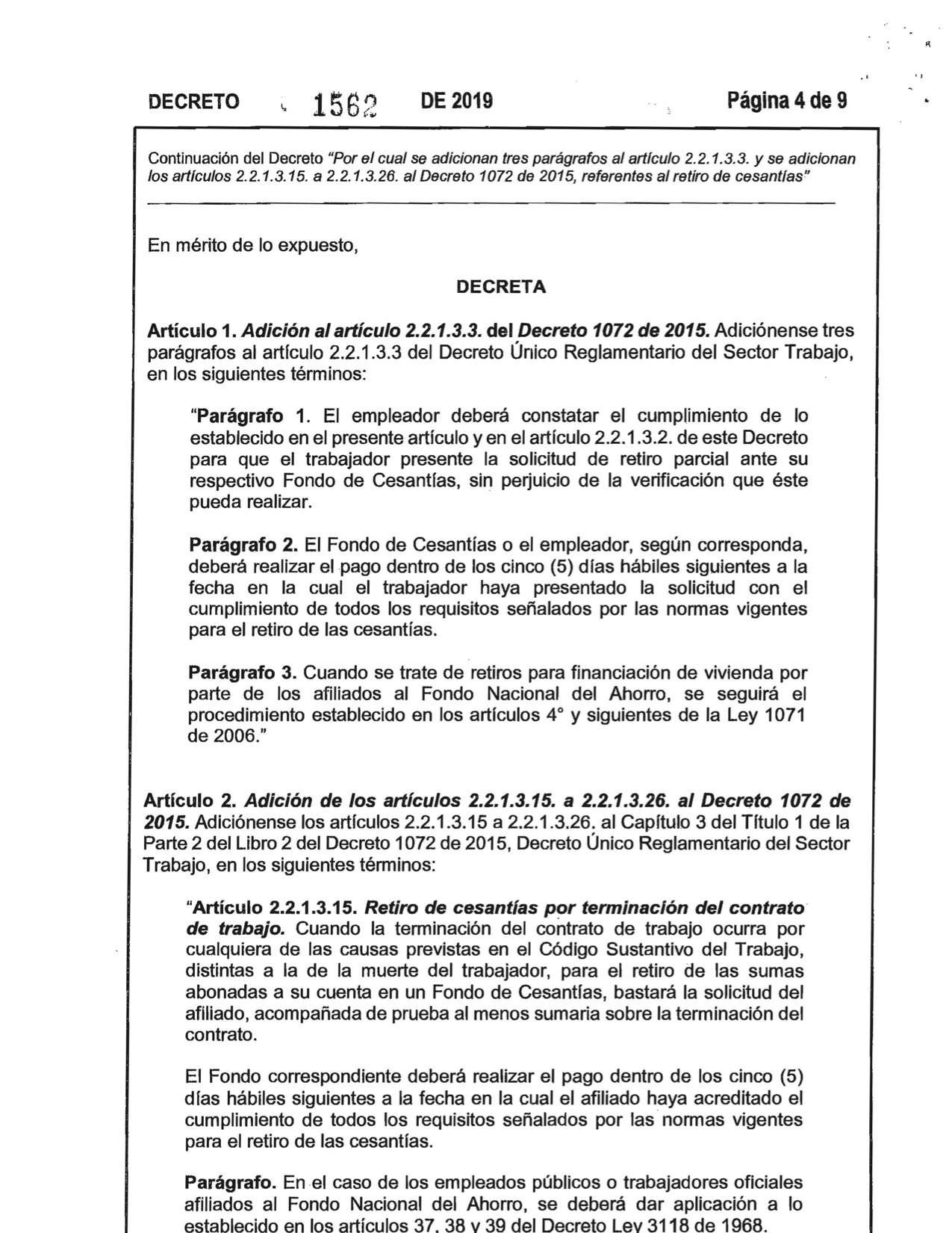 Decreto 1562 de 2019. El Ministerio del Trabajo expidió el Decreto No. 1562 del 2019, Por el Cual se adicionan tres parágrafos al articulo 2,2,1,3,3 y se adiciona los artículos 2,2,1,3,15 a 2,2,1,3,26 al Decreto 1072 de 2015, referentes al retiro de cesantías.