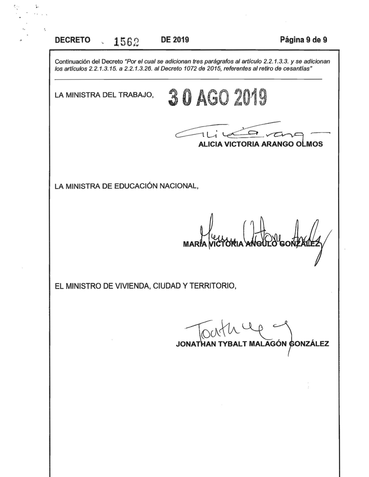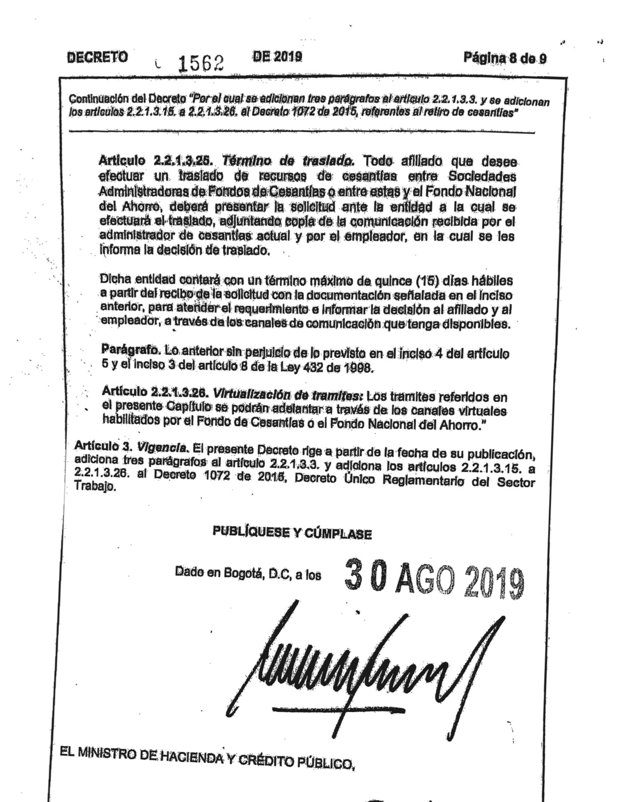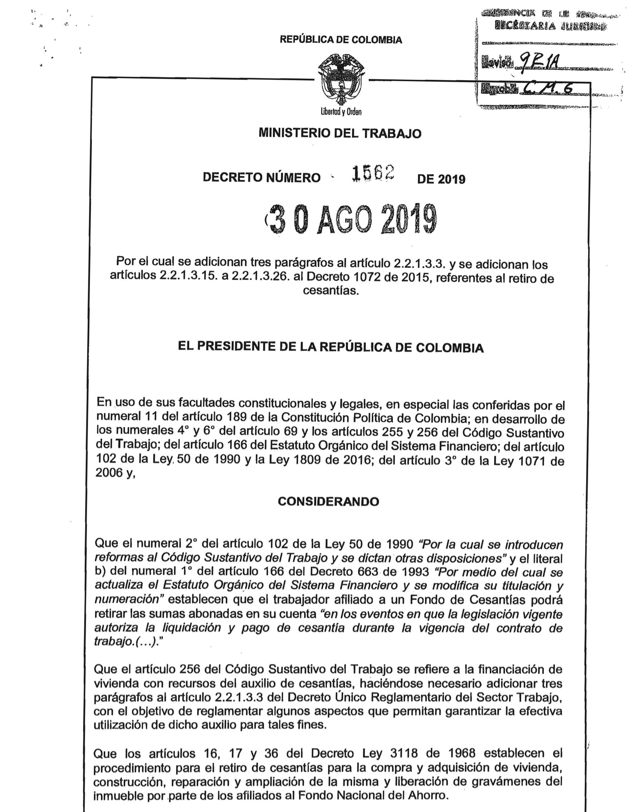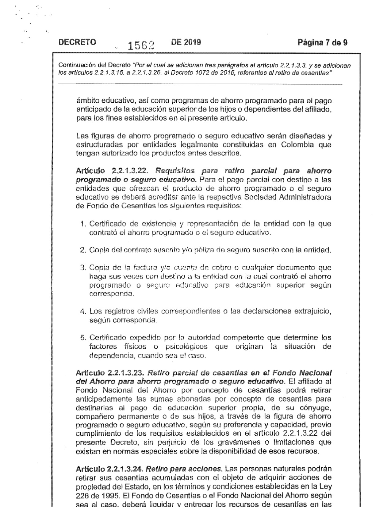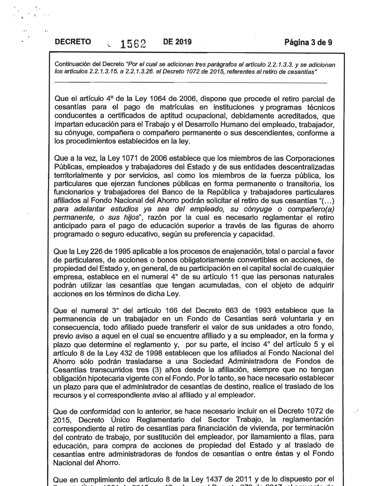Decreto 1562 de 2019. El Ministerio del Trabajo expidió el Decreto No. 1562 del 2019, Por el Cual se adicionan tres parágrafos al articulo 2,2,1,3,3 y se adiciona los artículos 2,2,1,3,15 a 2,2,1,3,26 al Decreto 1072 de 2015, referentes al retiro de cesantías.